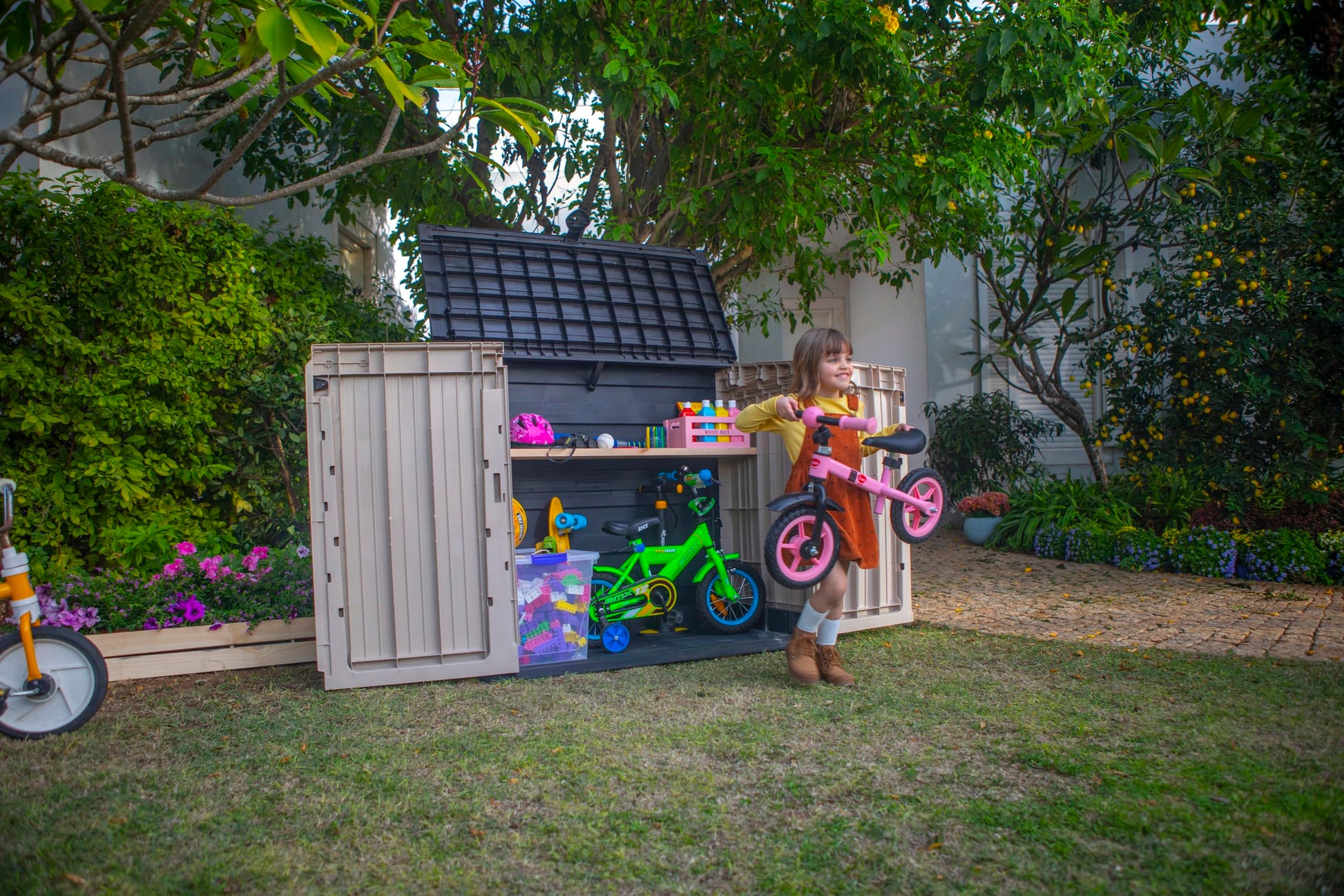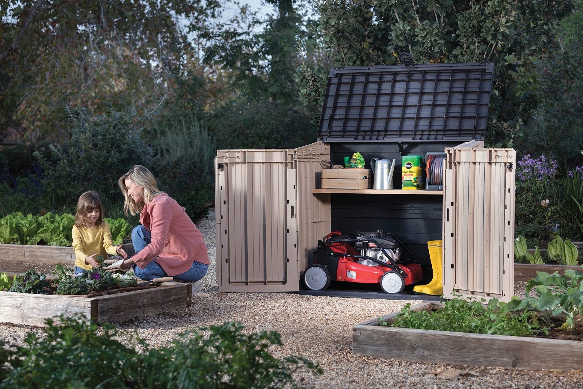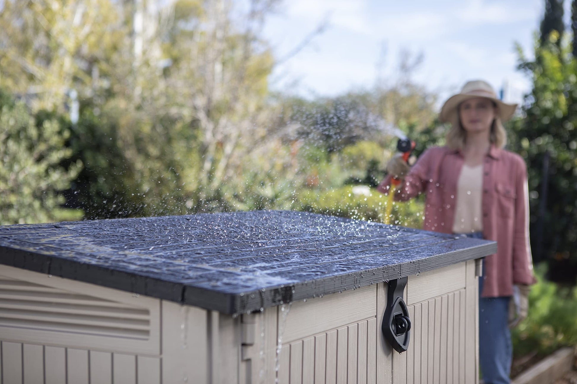 - Ideal outdoor storage solution for garden tools and equipment, BBQ and accessories and x2 120L wheelie bins